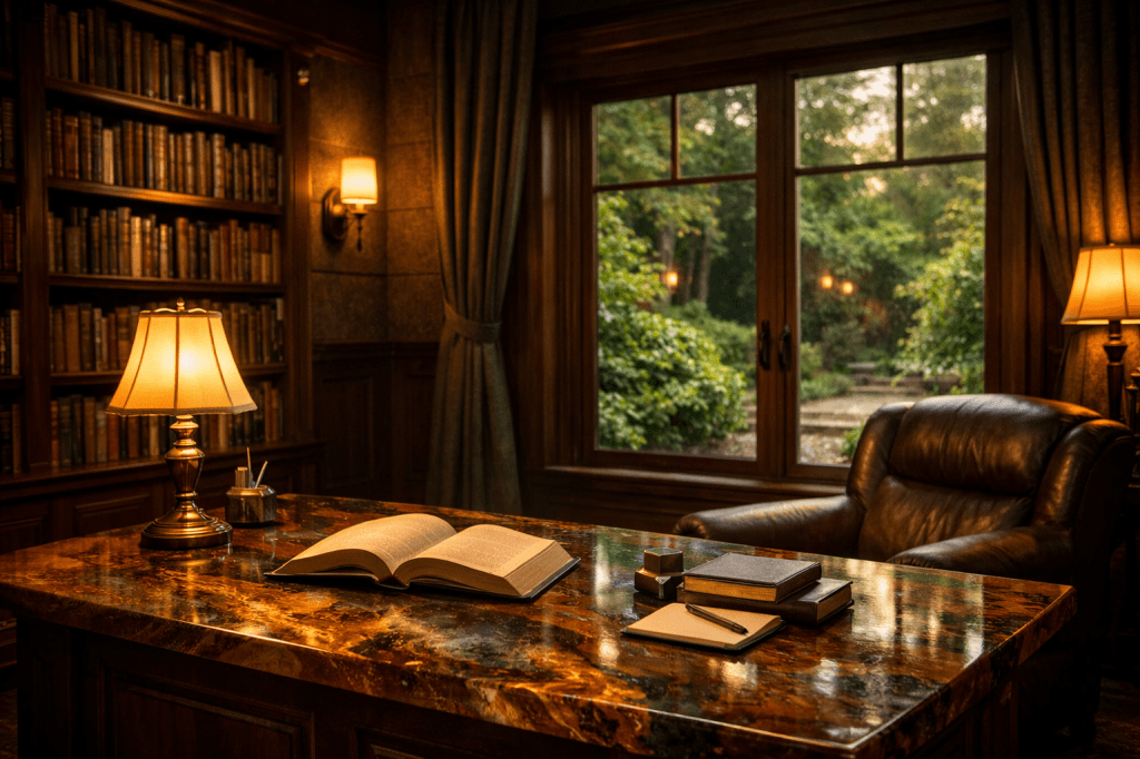 The furniture would be in darker tones, creating a warm and grounding presence in the room. Soft, ambient lighting would fill the space, allowing for a calm and immersive reading experience, while adjustable lights would make it brighter whenever needed. The walls would be soundproofed to minimize outside noise as much as possible, preserving the silence and focus that reading and writing demand.
