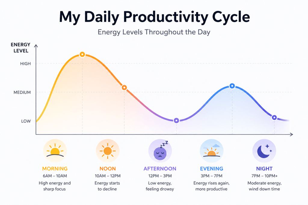 After lunch, it drops further. Drowsiness kicks in, and although I feel like sleeping, I usually resist it. Productivity during this time is a challenge.